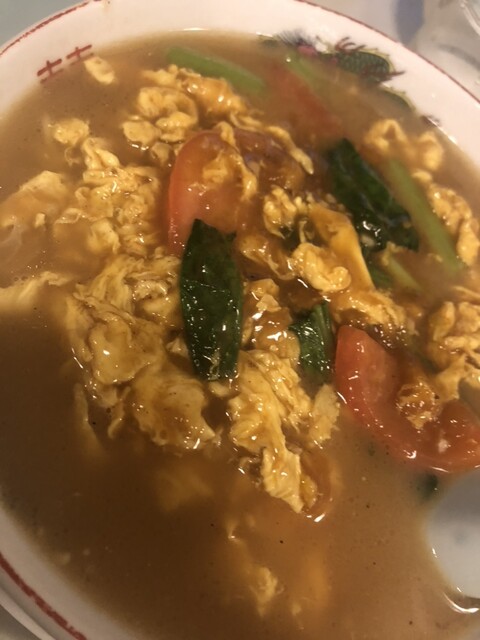 平日限定のトマトたまごラーメンもたまごとトマトを餡に絡め炒めたものが麺の上に乗っていて、スープと餡が絡んで抜群に美味しいです。