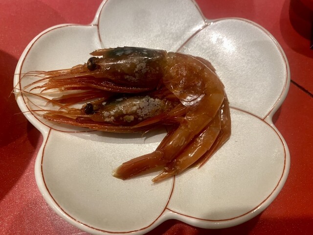 ○甘海老の醤油漬け 頭は最後焼いてくれます