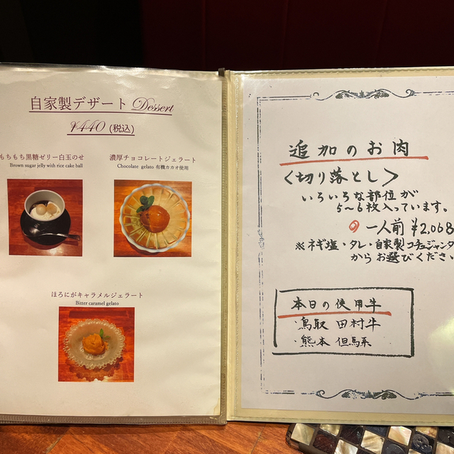 この行った日のメニューを見るとこの日の肉は、鳥取 田村牛と山口 萩牧場 但馬系です。