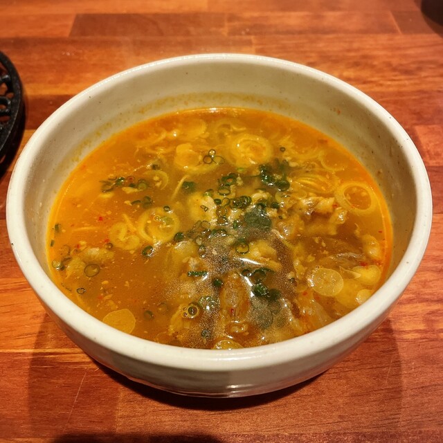 この日の牛の産地は、鳥取の田村牛とマルセの神戸ビーフ。どっちもめちゃくちゃ美味かったけどこの日はマルセの神戸ビーフさん、凄く良かった。ただこのお肉食べるの生涯最後になりそうです。マルセの神戸ビーフの生産者のお一人である東良さん、今回の牛を最後に引退を決められてるとの事。なので今回食べる肉が東良さんの肉を食べる最後の機会でした。ガツンと口の中に広がる旨味、赤身はこれが肉なんだよ?と問いかけてくる様な旨味のインパクト。脂に見えるけど口に入れるとスイーツ食べたみたいに甘く感じる。色んなお肉食べてるけど、この系統の脂の美味さにはそんなに出会える物じゃ無いですね。焼肉かねこさんにあとどのくらいマルセの神戸ビーフがあるか分かりませんが、運が良ければ和牛の最高峰を味わえると思います。この最後の機会に当たって良かったです◎