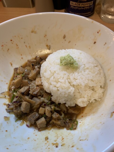 食べ進めた後のお楽しみは“追い飯”。残ったタレと具材にご飯を投入し、ワサビをちょこんと添えると、香りと辛みがアクセントになり、最後まで飽きずに完食。まぜそばとしての満足度はもちろん、〆ご飯まで計算された一杯です。