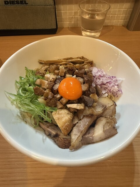 まず目を惹くのは丼の中央に輝く卵黄。これを豪快に麺と絡めることで、まろやかさと濃厚さが一気に広がり、特製ダレの旨みとともに極上の味わいに。