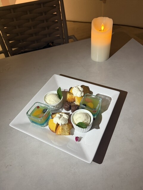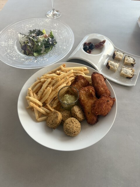 フィッシュ&チップスには、バジルとアーモンドのジェノベーゼソースが添えられ、味わいに変化を加えてくれます。締めには、ホテル「ル・パン」の特製ドルチェ3種盛り。見た目も美しく、最後まで満足度の高いコースでした。