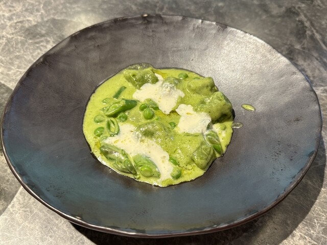えんどう豆のソースとリコッタチーズと一緒にお口の中へ…噛めば噛むほどほうれん草の香りが広がり…美味しい!