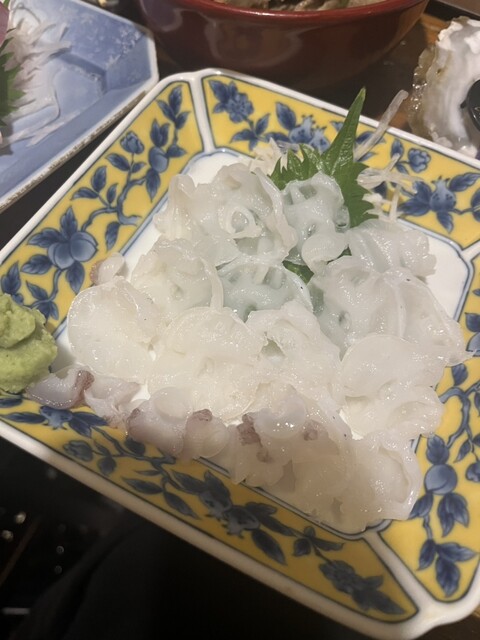 ☆カンパチ、活きダコのお刺身→両方新鮮。活きダコ好きで自分でも買うけど、こんなに薄く切れないから、嬉しい。美味しい。個人の感想ですが、ツマ好きだけど、ないのも良いかと思います。お刺身!贅沢!て思う笑。