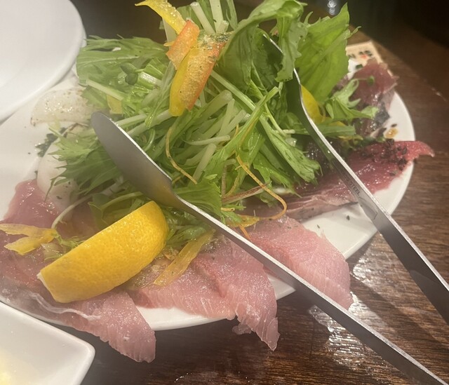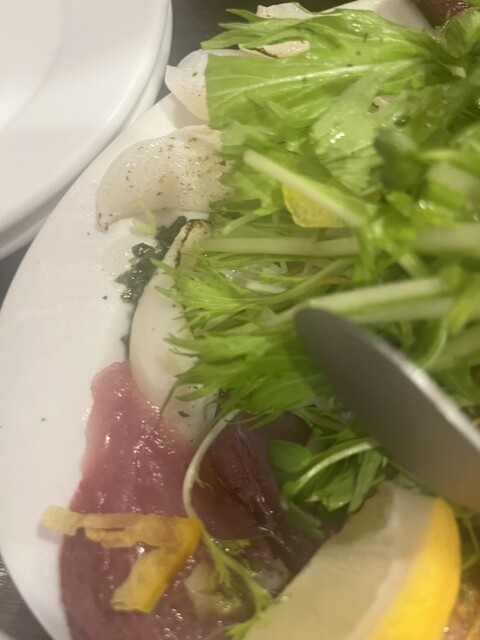 ☆カルパッチョ→カツオ、ワラサ、炙りイカ。イカのカルパッチョってあまりないけど美味しかった。どれも大きく切られてます。