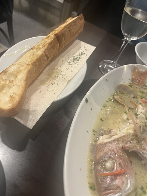 ☆紅葉鯛のアクアパッツァ→おすすめから。アクアパッツァは間違いなく美味しい。違いがわからなくて申し訳ないですが。頼んだバケットは何故かいつもガーリックトースト。個人的にはシンプルなバケットで良いんだけど、なんかこだわりかなぁ、家で作れそうで作らないから笑、美味しくて嬉しい。