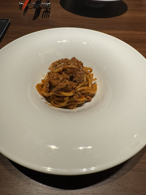 パスタはハンバーグを崩して食べるボロネーゼ。