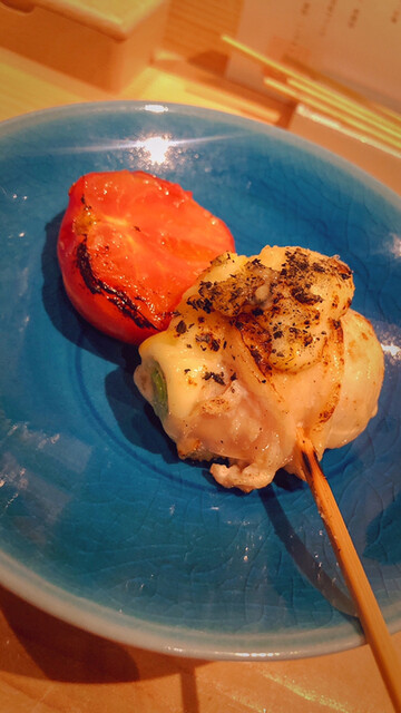 6串目は、皮めがプリッとした鶏肉の中に葱!そしてとろーりチーズ。トマトは焼いてるから甘い!この串にとっても合う!