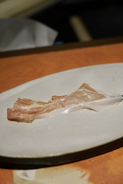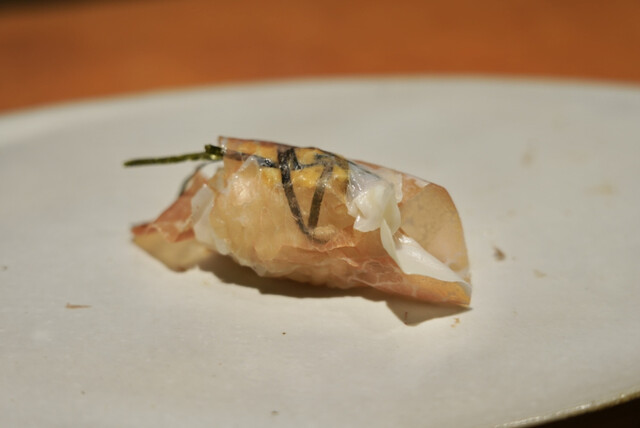 ○鹿児島県産黒豚 自家製5年熟成生ハム(お尻の香り強い部分)地元のトマト(セミドライ)と真鱈の白子松前焼きの組み合わせ