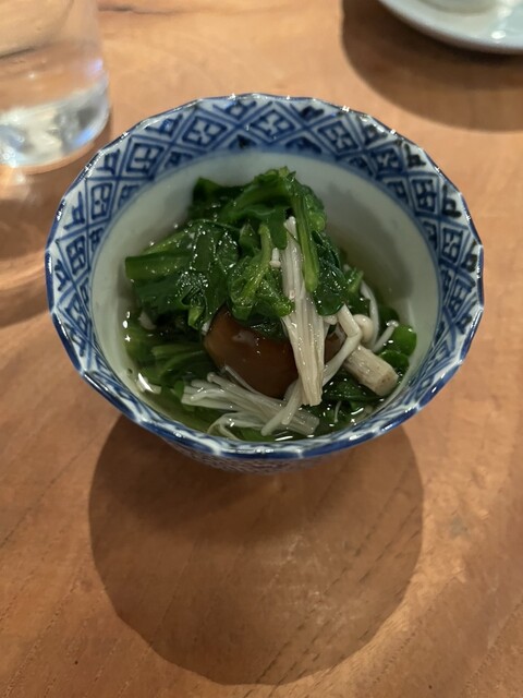 春菊ときのこのおひたし:筆者が今回最も感動した一品。春菊の苦味が口内をリセットして、さらにご飯が進む味わい。椎茸やナメコなどが入っており、薄口醤油とお出汁で丁寧に作られた逸品。