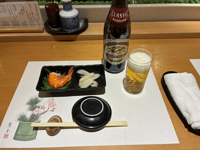 いつも通りの瓶ビールキリンラガーと刺し盛りで乾杯スタート。追加で【ゲソわた】半分と【穴子ツマミ】を塩タレ半々と【雲丹ツマミ】半分を注文!