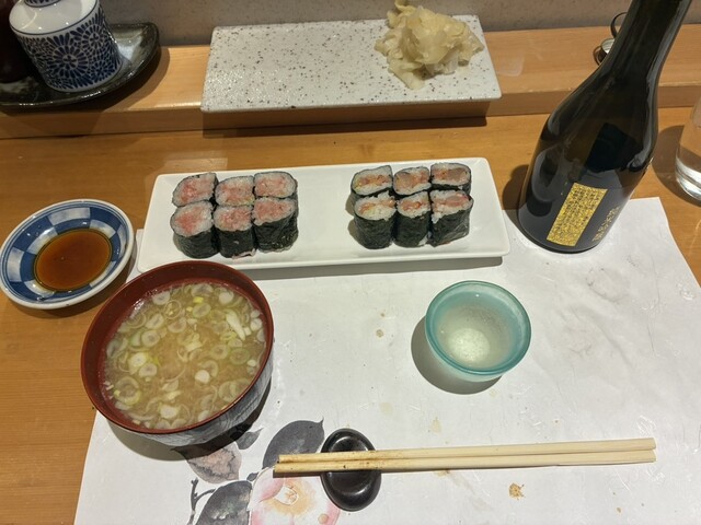 巻き物、ネギトロ巻・赤貝のヒモ巻・あら汁。