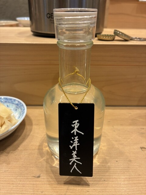 カウンターにはグラス2個(お酒用と水用)&お猪口と栓抜き、にぎり用の皿(ゲタと言われる木の台では無い)だけがセッティングされていて、醤油や小皿は見当たらない。
