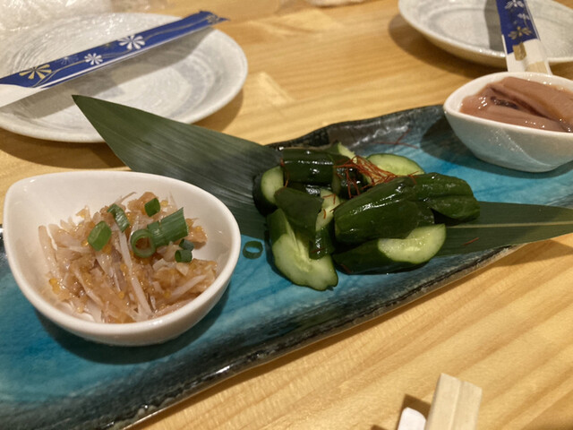 三点盛りは梅水晶、きゅうりの浅漬け、塩辛。