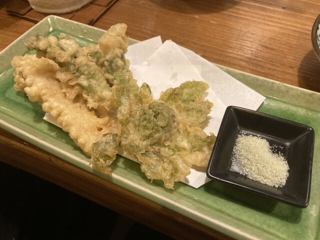 春野菜の天ぷらは、タラノメ、菜の花、島らっきょ。