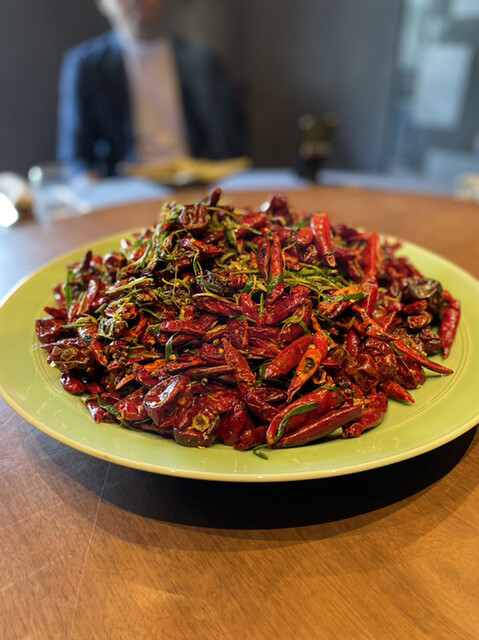もの凄い量の2種類の唐辛子の中にスペアリブが埋まってます