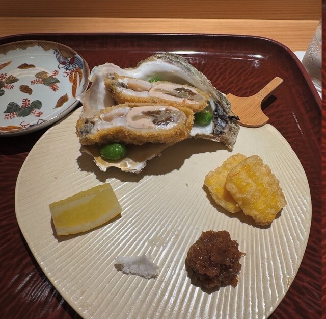 鳥取産岩牡蠣『夏輝』のフライはクリーミーで、愛知の新銀杏と玉蜀黍『味来』、らっきょうソースとの組み合わせが新鮮で個性的でした。