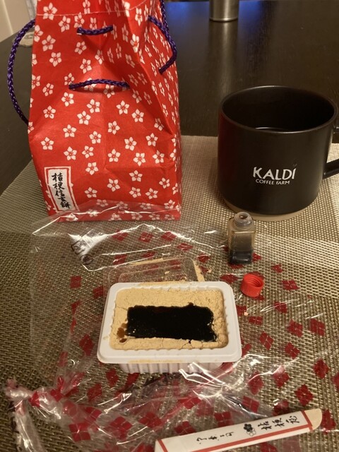 限定に黒い袋の桔梗信玄餅をお土産に購入しました。