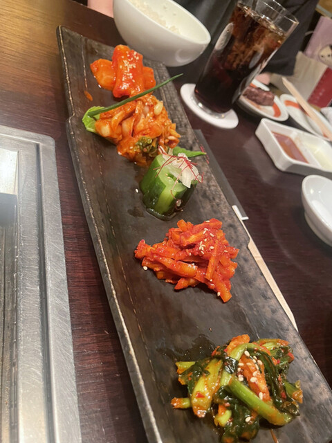 季節のキムチの小松菜のキムチ、ダイヤモンドカットカルビ、トック、上ミノ、クラフトコーラが特に美味しかったです。