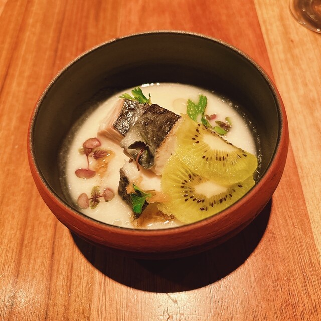 ふんわりと蒸した鰆に、カブの温かなポタージュ状のソース。キウイが冒険。ふわふわしっとりした鰆は、その皮目がキウイと合う。