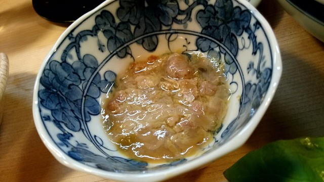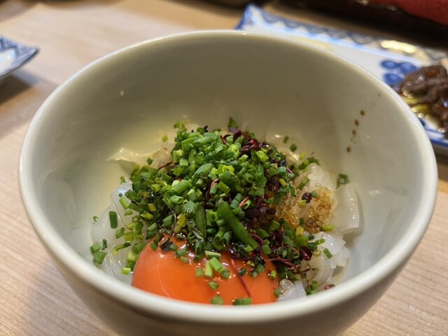 烏賊の細切り、卵の黄身、飛子、紫蘇、雲丹、ネギ等が入っており、混ぜて食べ、終盤にはシャリを投入して、食のハーモニーを…本当に絶品です!