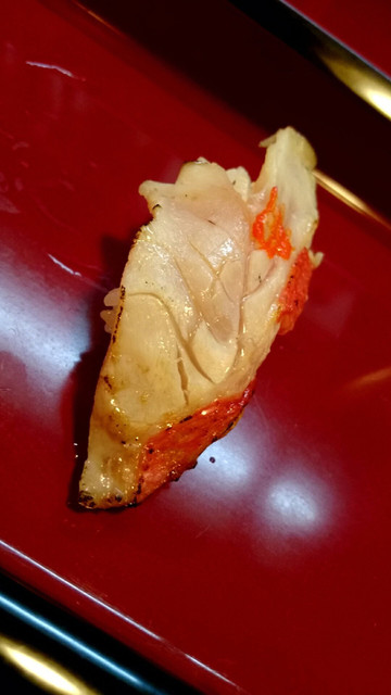 →鱸の昆布〆、鯨ベーコン、蝦蛄(しゃこ)、金目鯛の炙り、穴子を順に出してもらいました。大将から言われるままの食べ方で、出されてサッと口にいれます。