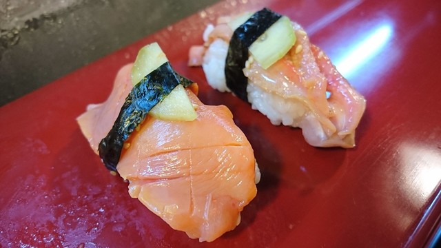 カウンターは綺麗な杉の木で、寿司を置く場所は、昔からある赤と黒を基調とした台場です。