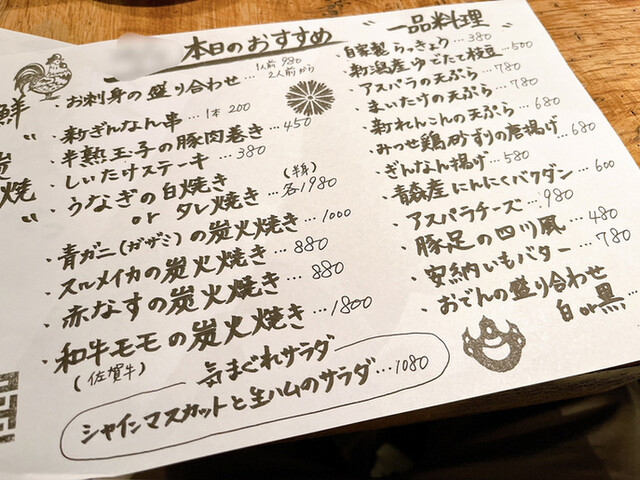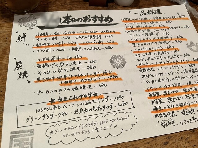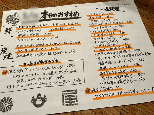 通常メニューは焼鳥をメインに、サラダ、鉄板、揚げ物、御飯物等。本日のオススメには鮮魚が多く占め、旬な野菜等もあり、この棲み分けとバランスが個人的にヒットポイントの1つ。笑