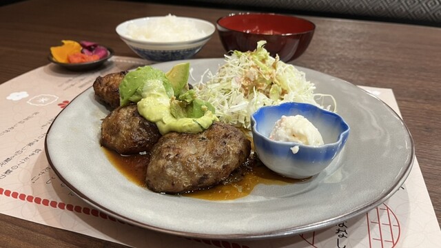 テーブル席にて、まずはメニューを拝見、ハンバーグメニューの多さに迷いましたが、その中でも気になった『ダブルアボカドハンバーグセット 1749円+追加ハンバーグ 440円』を発注。
