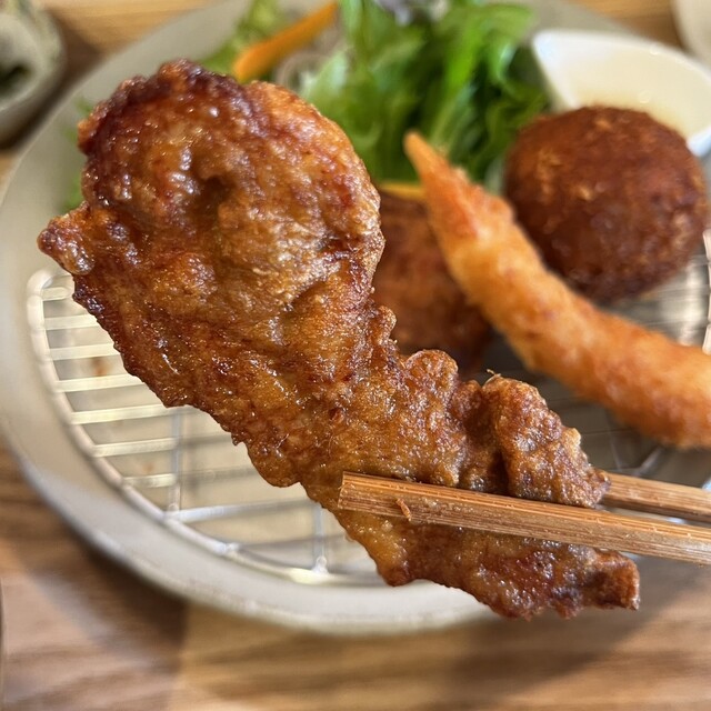 まんまるなコロッケと豚唐揚げが2つずつにエビフライが盛り付けられたお洒落なプレート✨