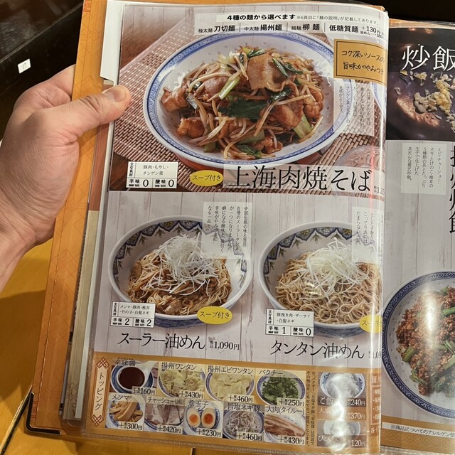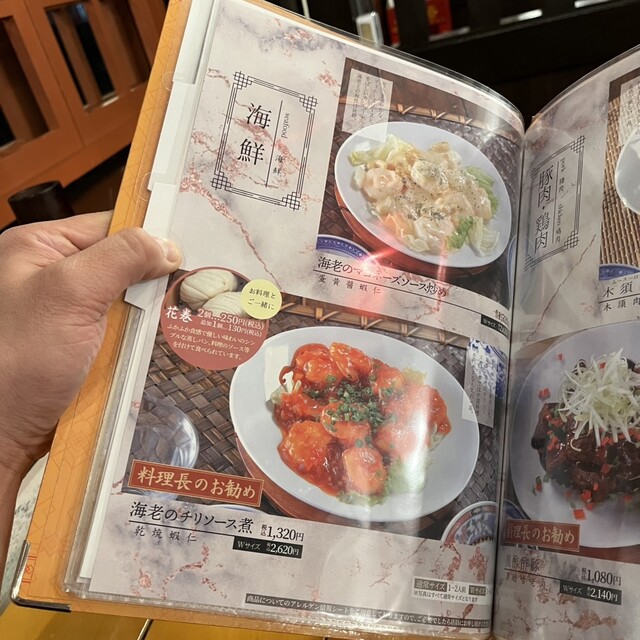 レトロ中国な雰囲気の店内テーブル席にて、まずはメニューをひと通り拝見。