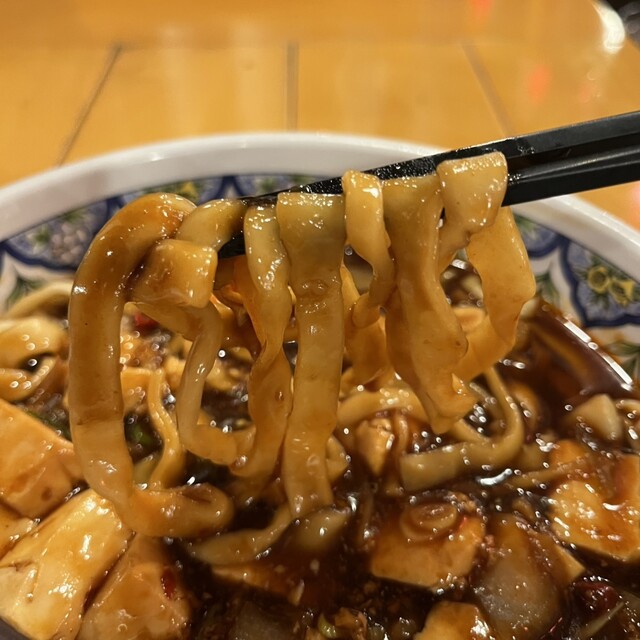 麺の生地を刀で切ったという極太の「刀切麺」をリフトすると麻婆スープがコーティングされ、モチっと食感で食べ応えは十分❗️