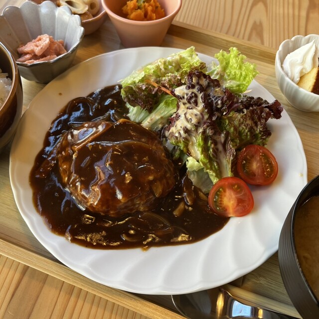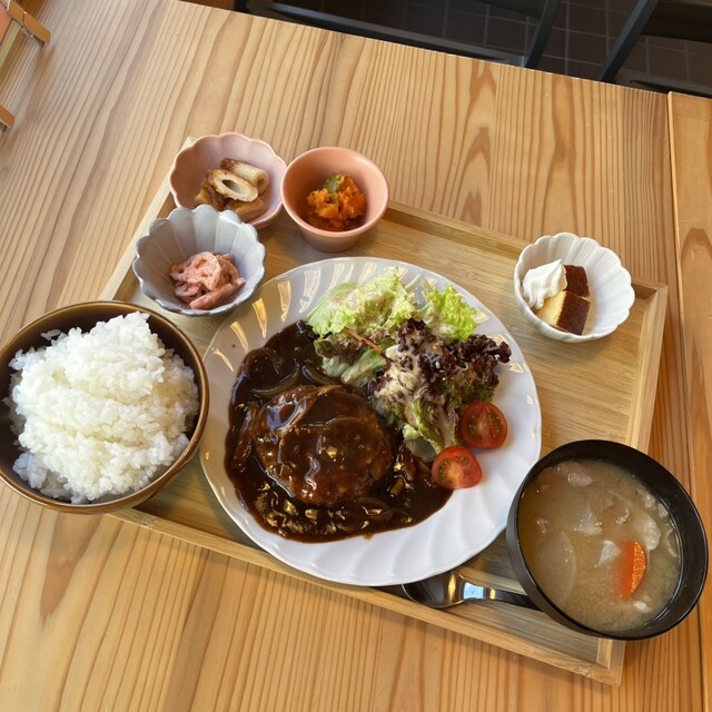 歴史感じる建物に入店、木の温もり感じるリノベされた店内テーブル席にてお外のメニューから発注したのは、まるおのランチ『A.ハンバーグ 1000円』白飯は大盛りをお願いしたところ、サービスしてもらいました〜感謝。