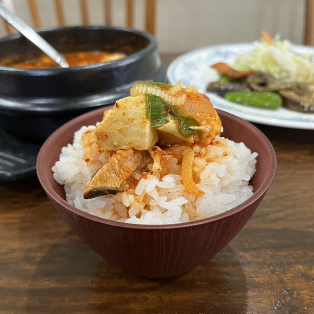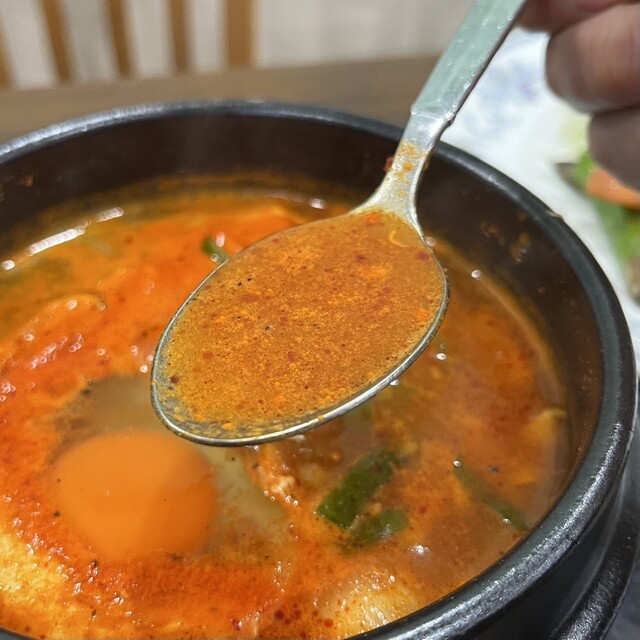 程よい辛さのチゲスープ、お豆腐やあさりを白飯に乗っけると、食欲加速❗️