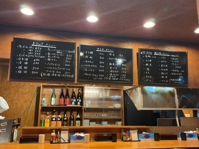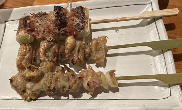 ハツ、肝、親皮、皮、ネギマ、ズリ、ハラミ、せせり、肩小肉、軟骨、しいたけ、白ネギ、枝豆、とり酢、モロキュー、トマトスライス、焼きおにぎり、えいヒレなどいただきました(写真参照)