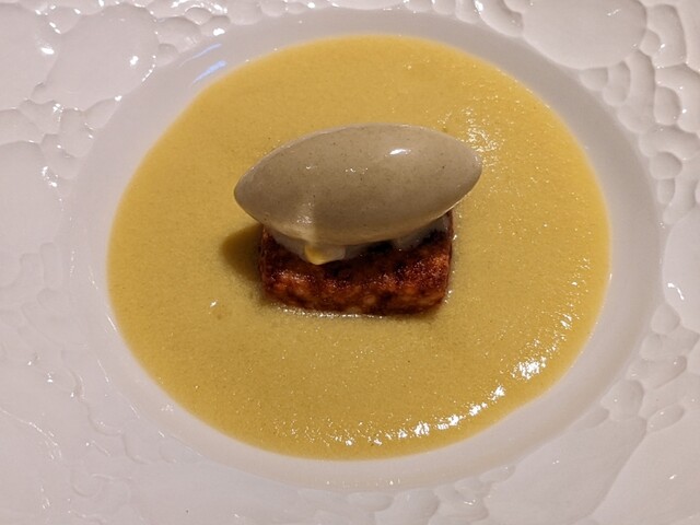 この日は、メインの前に取れたての鮑があるとのことで、追加でいただきました。この鮑がものすごいインパクト。これ以上ない火入れです。こんな絶妙な焼き加減は、他で見たことがないです。肝のソースと共にいただくのですが、頂いている間終始唸ってしまう一皿でした。