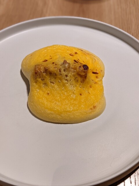 このあたりで焼き立てのパンを出していただきました。この辺はごはんが好きな日本人にとても合せてある試みですね。パンというより炊きたてごはんを思わせるような、ホカホカ感。