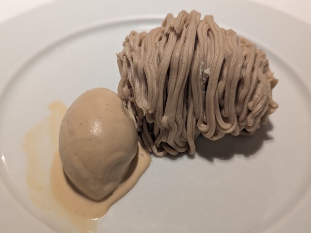 デザートには、和栗のモンブランを。茨城県の栗で、こちらではシーズン最後だそうです。まずポーションが大きくびっくり。栗のアイスクリームと相まって栗だらけ。今年栗食べ納めかもしれません。栗そのまま食べているような濃厚さです。しっかりずっしり、これぞフレンチ。