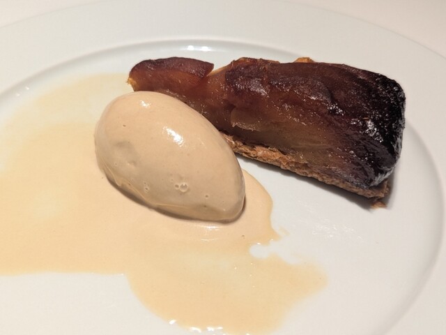 相棒の選択はタルトタタン。一見小さいですが、りんご1.5個が凝縮された飴色の彫刻のようなりんご。パリッパリのパイ生地が美しく、フランス伝統の味を感じます。