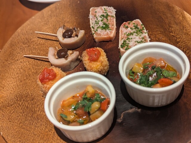 内容を決めて席に戻ると、アミューズから運ばれてきます。鶏のガランティーヌやラタトゥイユ、程よいカジュアル感の構成です。続いてパン。カンパーニュ風のパンが、生地の粘りもあっておいしいですね。