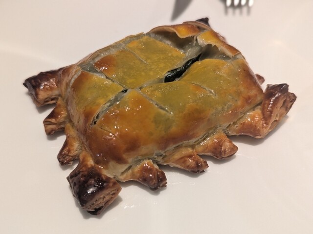 選択したお料理一品目は、蟹のパイ包み焼き。ベシャメルも入っていますが軽いです、と仰っていた通りの味わい、クリーム感よりも蟹です。ブイヤベース風のソースも軽やかで、パイという先入観を裏切る軽やさ。一皿目で違和感無しです。