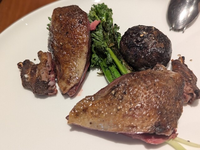メインの一皿目は、鳩。丁寧な火入れで、美しい赤身のねっとり濃厚な味わいが余す所なく楽しめます。混ざりけのない直球な味の胸肉は言わずもがな、筋肉や脂を感じさせる脚の部分や内蔵のカイエット、いずれもおいしい。実はラムのタジン鍋と迷って変えていただいたのですが、こちらのお料理で本当に正解でした(融通効かせてくださって感謝)。