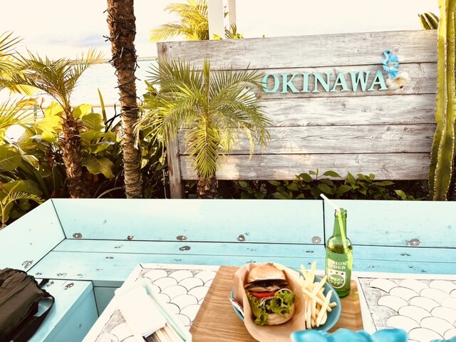 沖縄の爽やかな海風に吹かれてオープンテラスでいただくバーガーは最高。