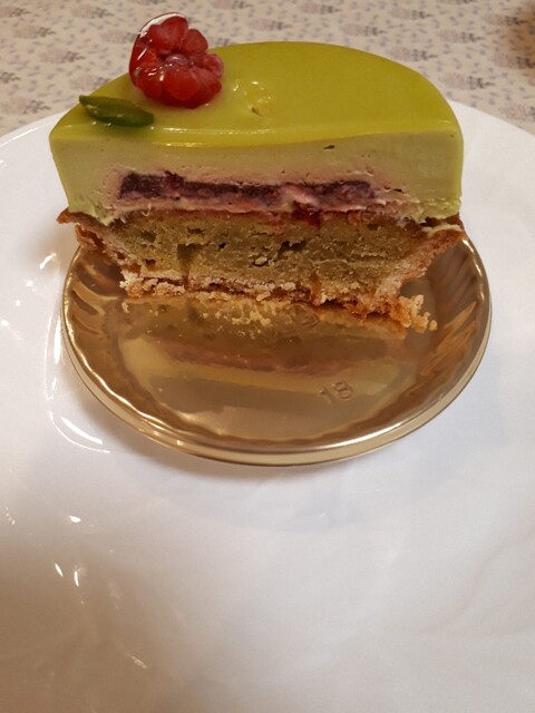 鮮やかな緑色のピスタチオムースは滑らか且つピスタチオの風味豊かで、甘酸っぱいフランボワーズのクリームとも相性が良かった。