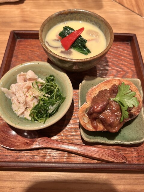 会津地鶏と信玄どりは柔らかめの肉質、黒さつま鶏と土佐ジローは脂が少なくて筋肉質、食感コントラストの連続で飽きさせない山香コースです。