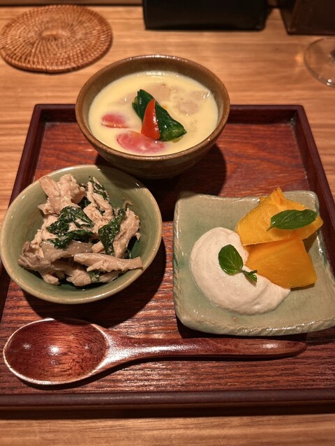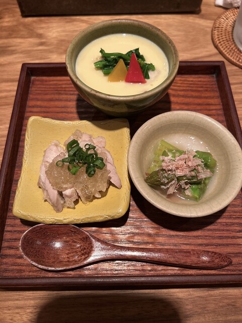 前菜3種やサラダに季節の食材がふんだんに使われています。