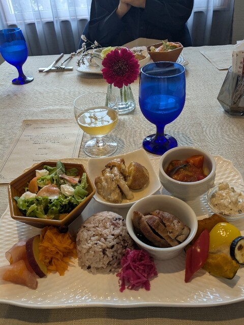 西岡の住宅街に佇む完全予約制、完全個室の一軒家デザートレストランでデザートランチ・コースをいただきました。カフェ・ド・ロマンの系列店なのでデザートにおもむきを置いた内容ですがランチプレートもしっかり食べ応えのあり、味もとても美味しく満足でした~そのあとに焼き立てのクッキーとフィナンシェにデザートが4品というボリューミーな内容。デザートはソルベ、チョコモンブランケーキ、かぼちゃのモンブラン&かぼちゃのチーズケーキ、ピスタチオとカシスのパフェでしたがどれも美味しくバラエティな内容で全て完食!フリードリンクでデザートにあった飲み物もチョイスできて大満足な時間を過ごすことができました。