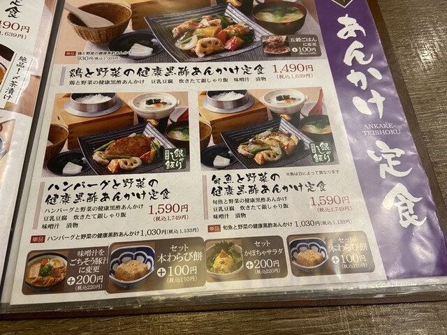 もう1人は、鶏と黒酢の健康黒酢あんかけ定食(鶏と野菜の黒酢あんかけ、豆乳豆腐、炊き立て銀シャリ飯、味噌汁、漬物)。