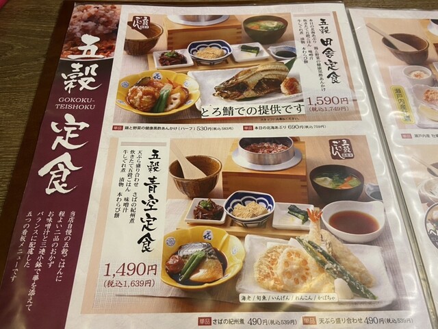 連れの2人は青空定食(天麩羅盛り合わせ、さばの紀州煮、炊き立て五穀ごはん、味噌汁、牛しぐれ煮、本わらび餅)と